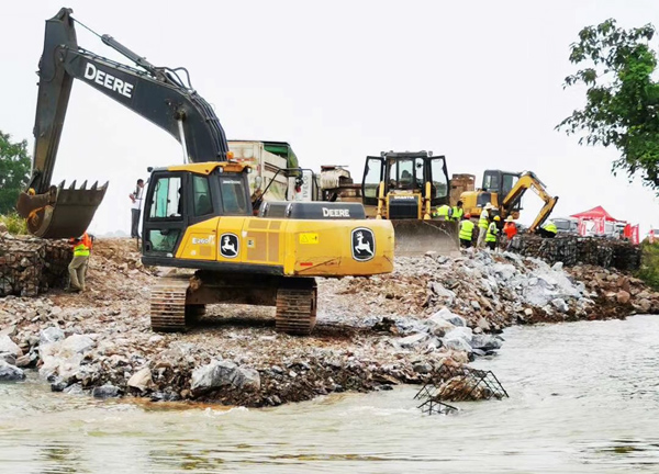 整個(gè)封堵工作共動(dòng)用水建公司400余名施工人員;調(diào)配挖機(jī)12臺(tái)、裝載機(jī)5臺(tái)、推土機(jī)2臺(tái)、運(yùn)輸車216臺(tái);調(diào)配塊石約3萬立方米、卵石約2500立方米、粘土約9000立方米、1立方米鋼筋籠260多個(gè)、3噸重混凝土塊160多塊。